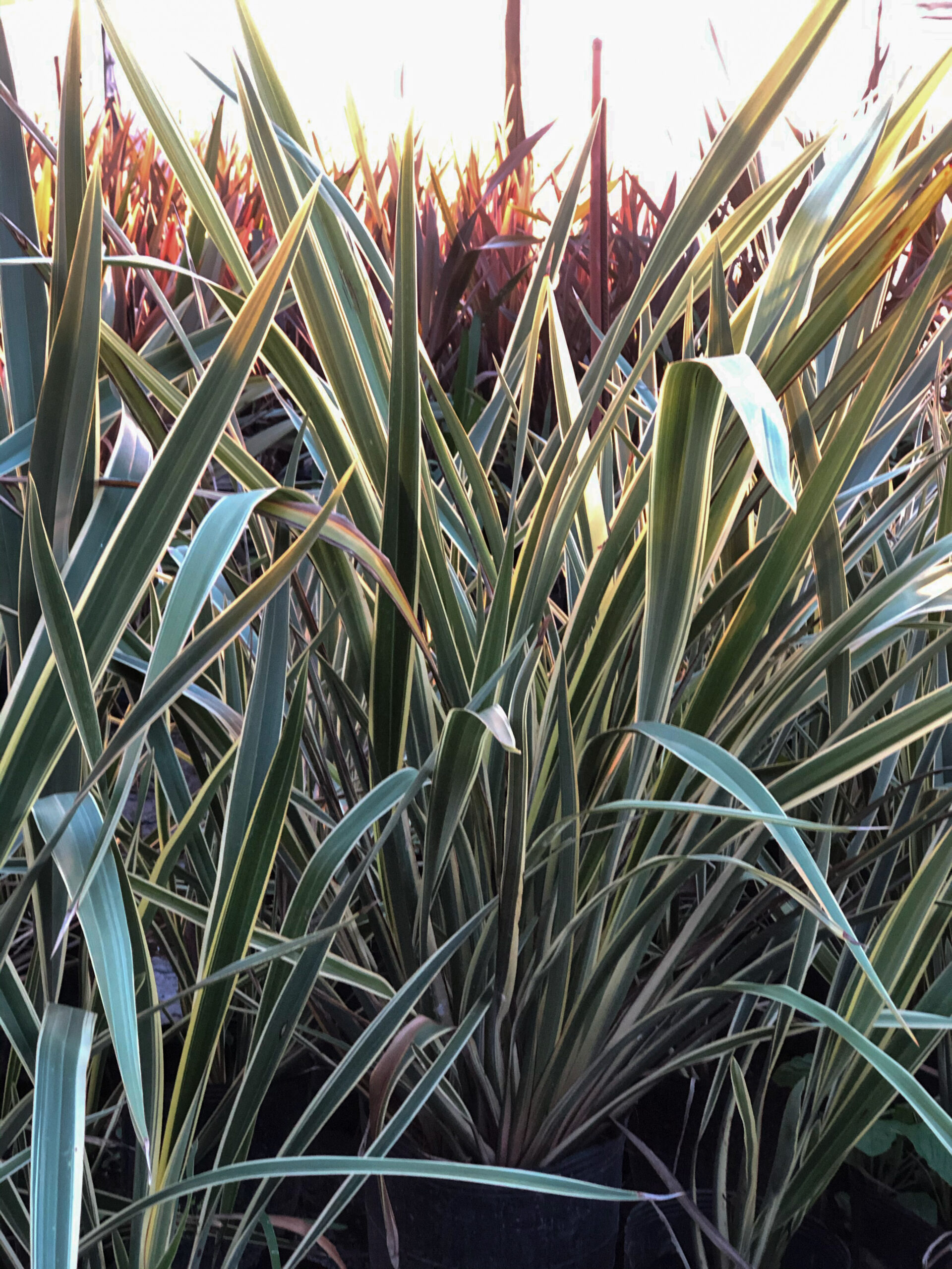 Nombre Científico: Phormium tenax ‘Aurea’ Arbusto perenne con hojas largas y arqueadas de color verde con bordes dorados, ideal para jardines modernos o como planta focal, aportando textura y color con su follaje ornamental.