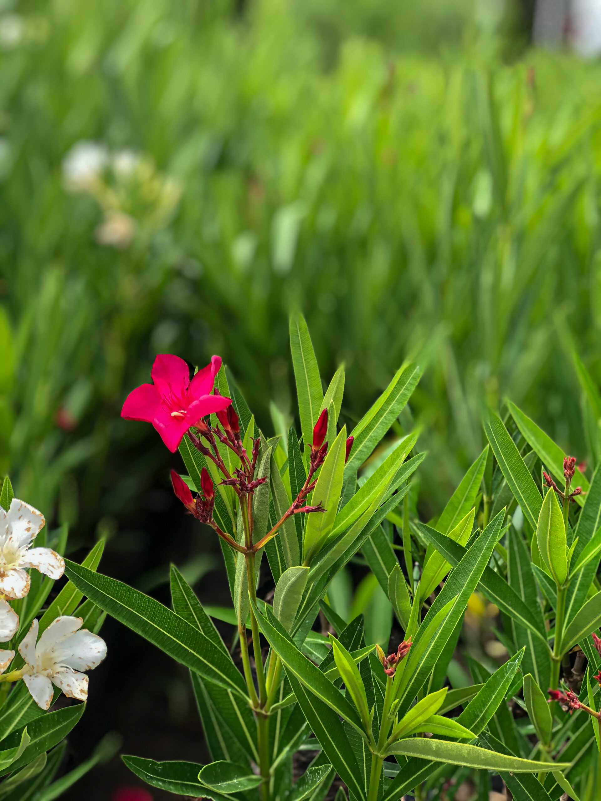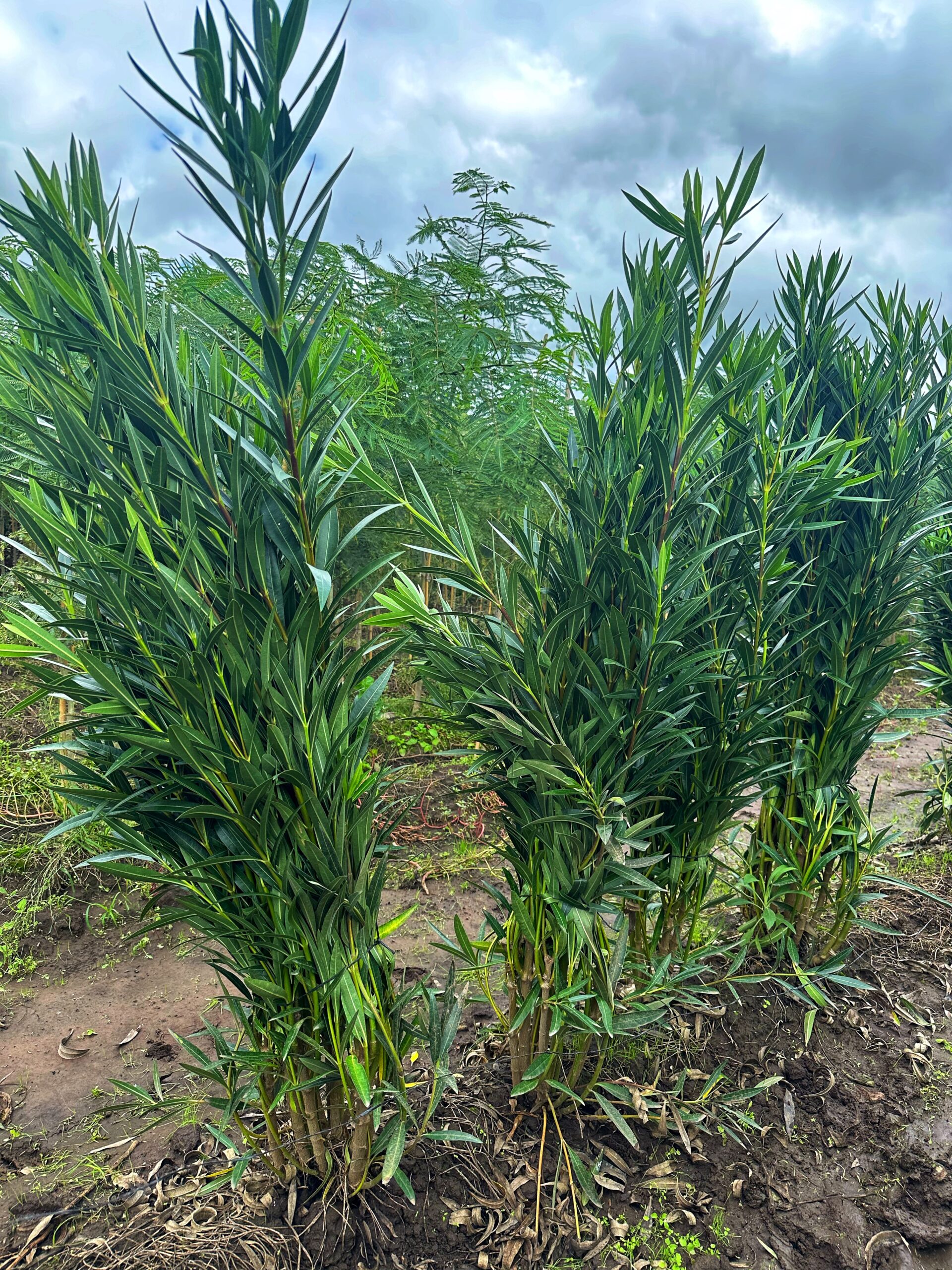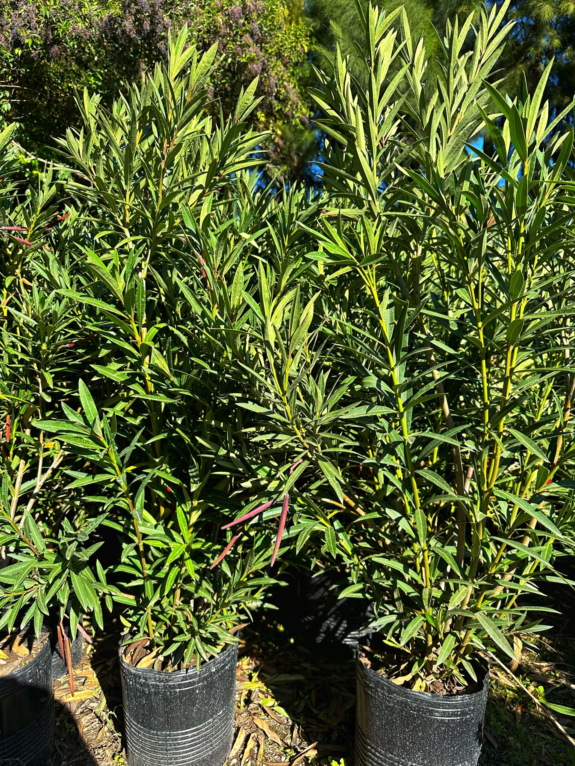 Arbusto con hojas largas y estrechas y flores vistosas en tonos de blanco, rosa o rojo, que florecen durante la mayor parte del año. Ideal para jardines y setos ornamentales en climas cálidos, proporcionando color y elegancia.