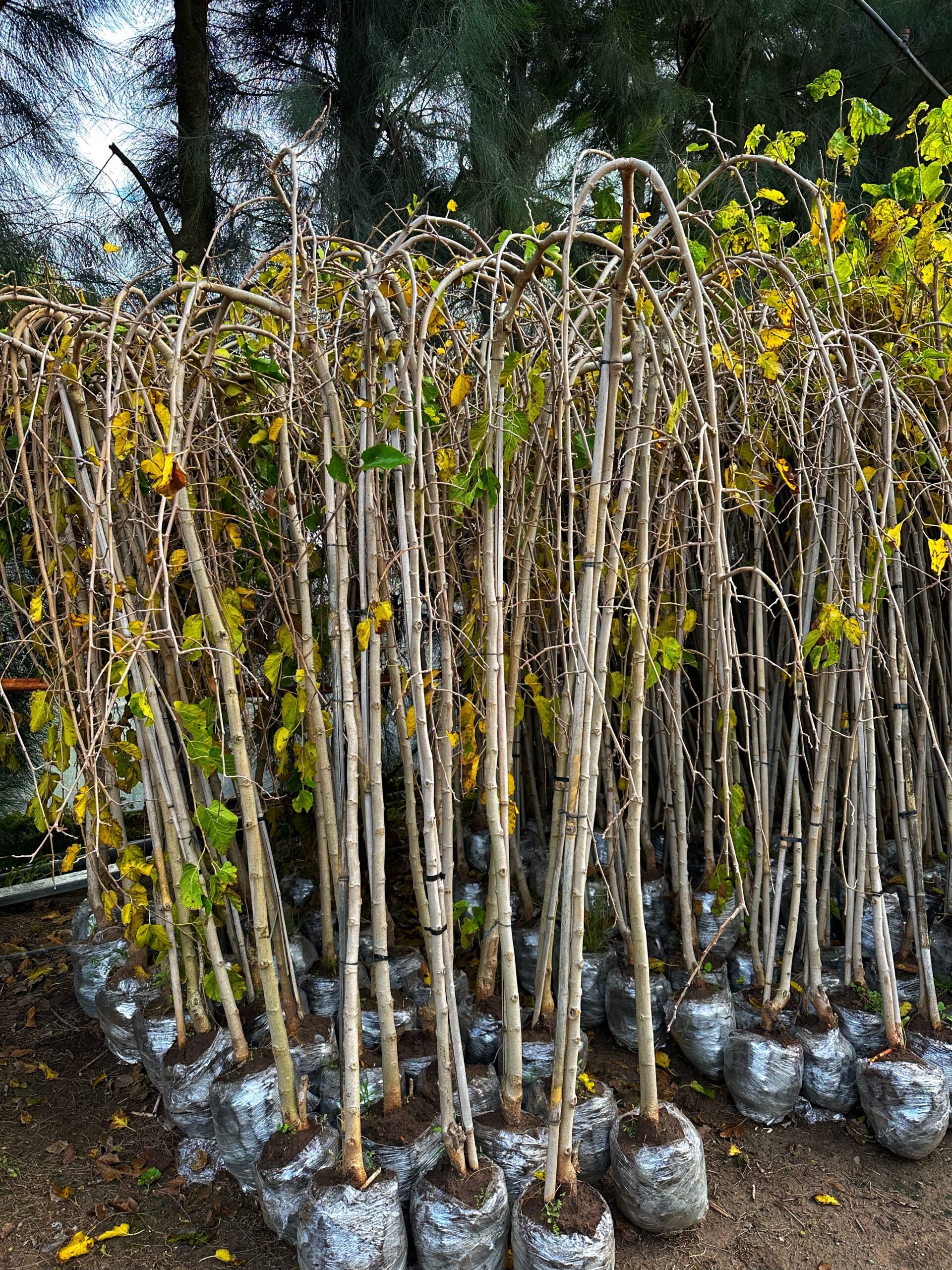 Árbol de tamaño mediano con una forma llamativa y ramas que caen hacia abajo, creando una apariencia de cascada. Produce frutos comestibles que van desde blanco hasta morado oscuro. Ideal para jardines ornamentales y paisajes, ofrece un efecto decorativo único con su follaje denso y sus ramas elegantes. También conocido como Morera Péndula o Morera Colgante.