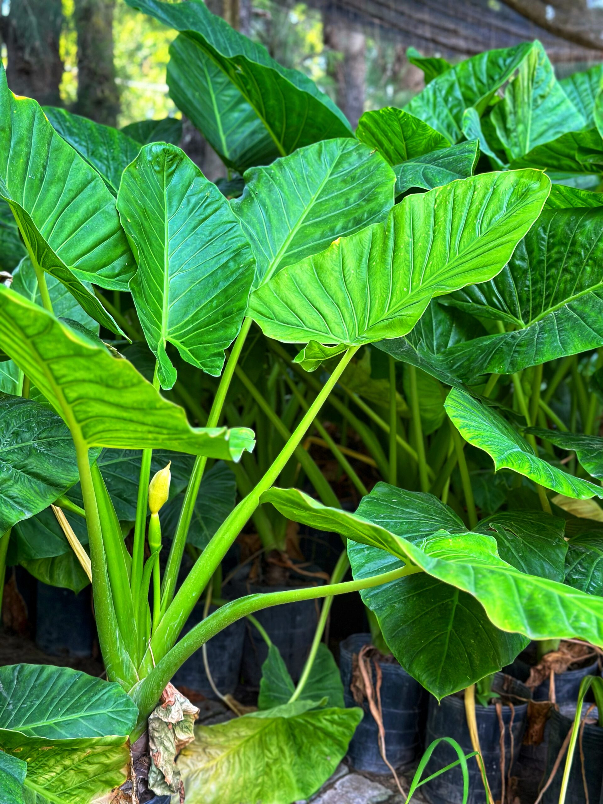 Nombre Científico: Alocasia odora Planta tropical con grandes hojas en forma de corazón, que aportan un aspecto exótico y lujoso a los jardines y espacios interiores. Ideal para crear efectos dramáticos en paisajismo y decoración.