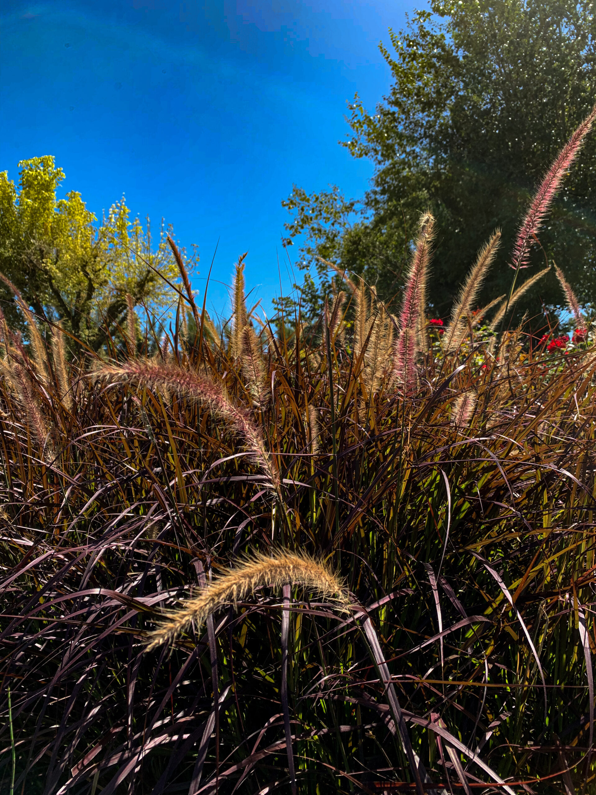 Gramínea ornamental con hojas largas y finas de color rojo púrpura que se mantienen vibrantes durante todo el año. Produce espigas aéreas de flores rosadas que añaden textura y color a jardines y macetas. Ideal para bordes y jardineras en climas cálidos.